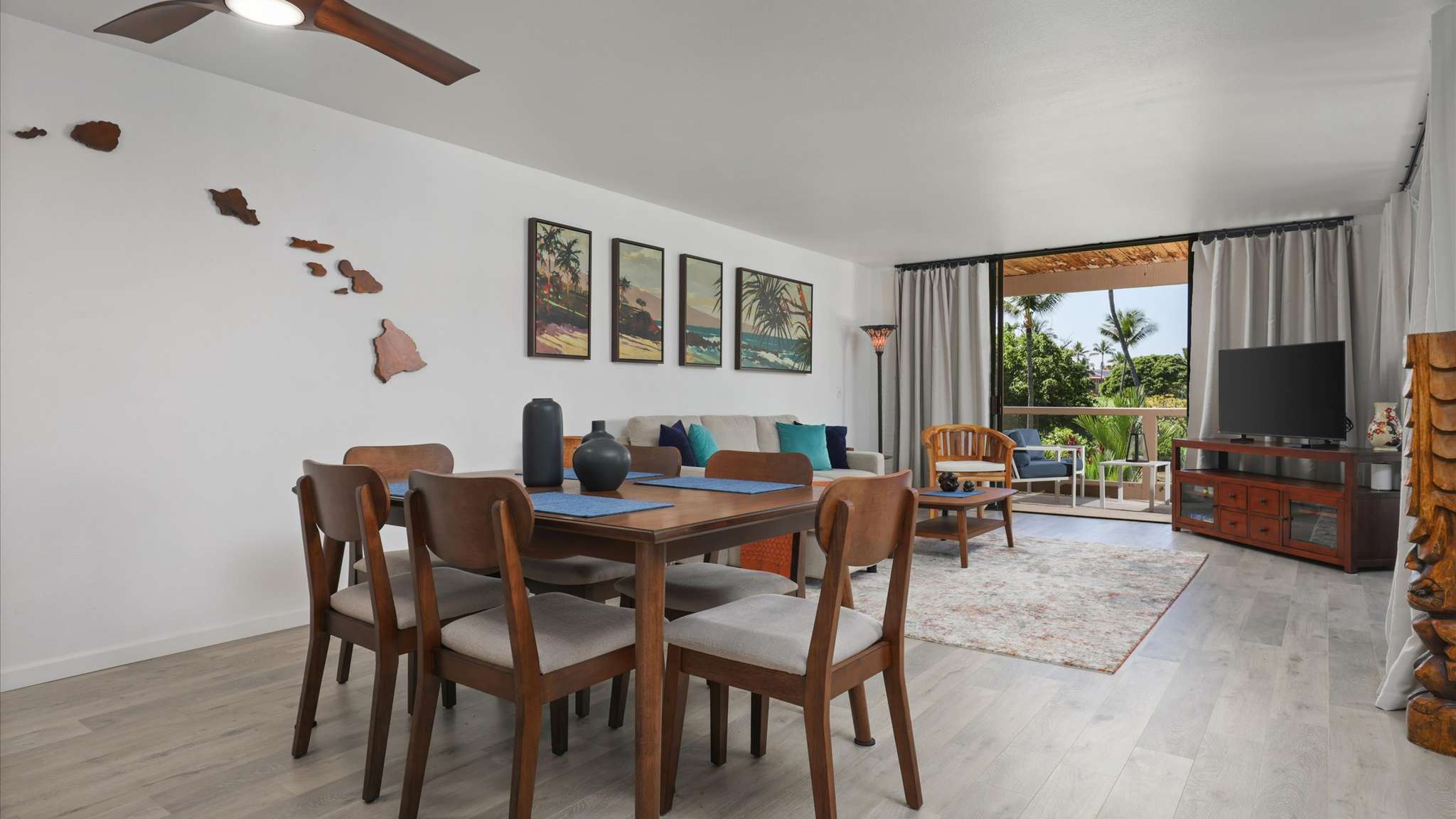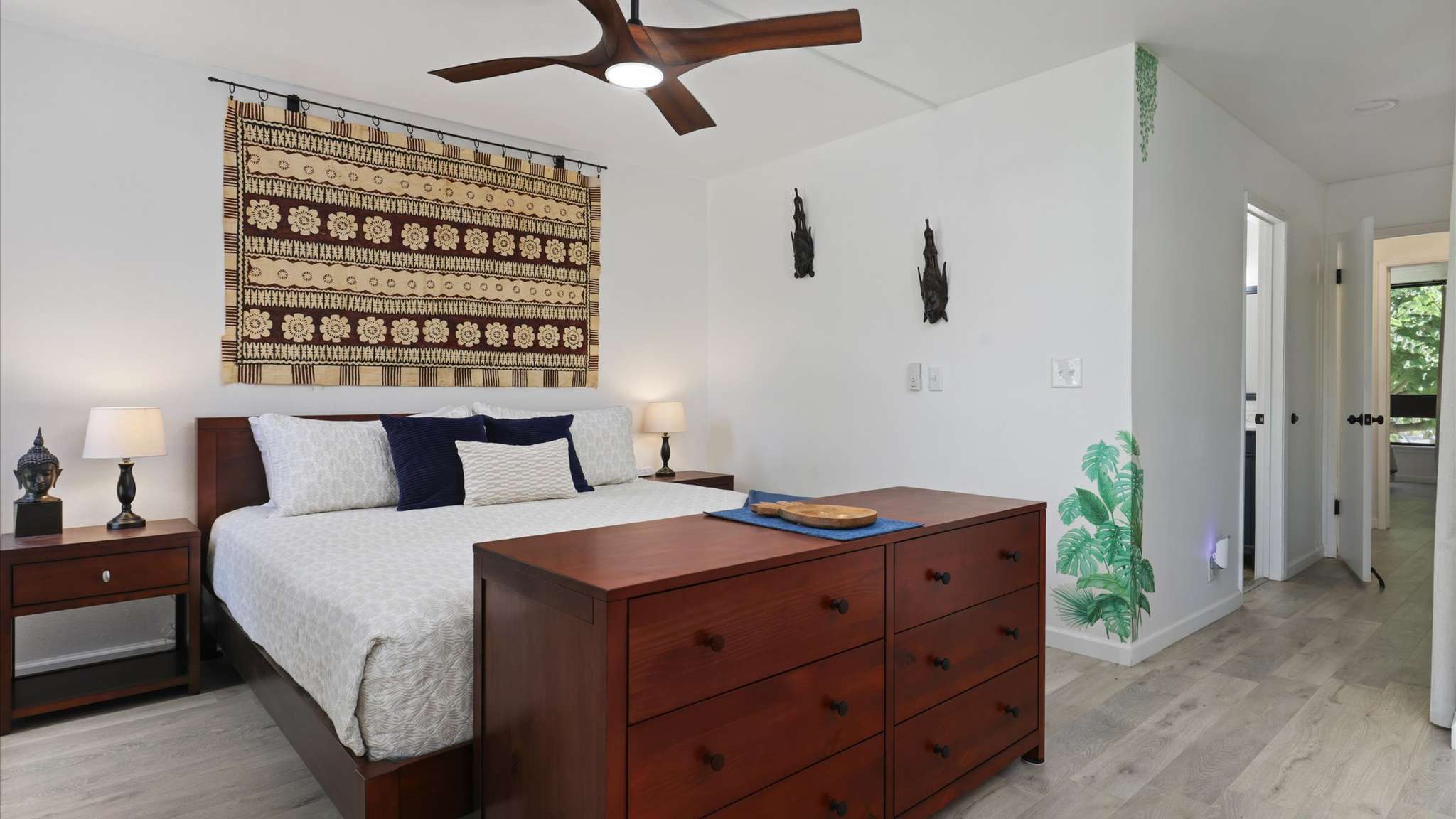 Inside, the home has been thoughtfully updated with sleek laminated flooring, stone countertops, and refreshed bathrooms. A brand-new washer and dryer add everyday convenience. But what truly sets this home apart is its collection of artwork and artifacts from across the Pacific Rim—Cambodia, Bali, Indonesia, Thailand, Japan, Alaska, and, of course, Hawai‘i—infusing each space with character and global charm.