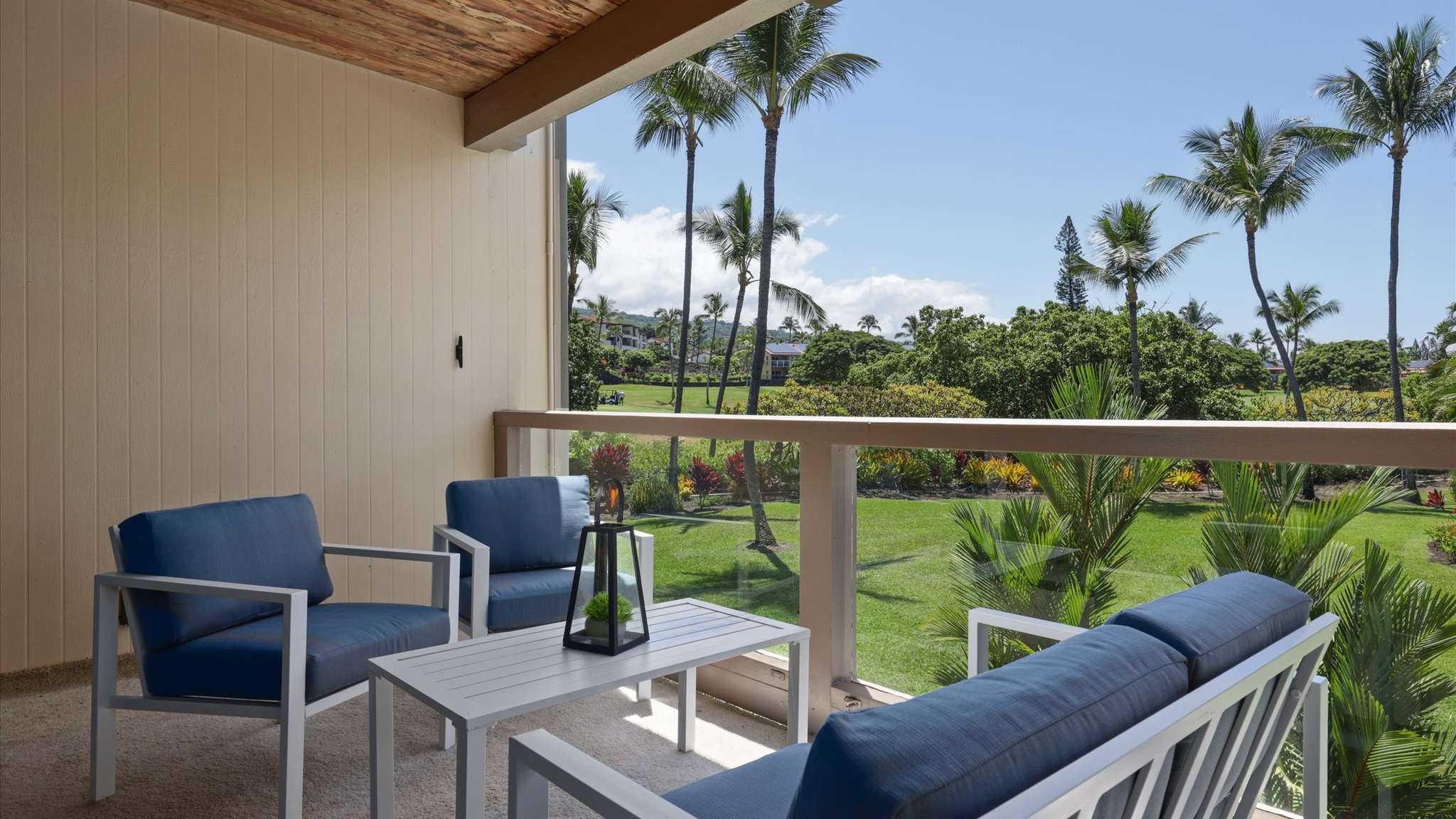 Set along the 13th hole of the Kona Country Club, the home opens up to a lush, tropical landscape filled with plumeria, palms, and royal orchid trees. With a 400 sq. ft. wrap-around lanai featuring two separate seating areas, you’ll enjoy sweeping views of the golf course, mountains, and even partial ocean vistas. Whether it’s your morning coffee or a sunset cocktail, every moment feels elevated in this peaceful corner of Keauhou.