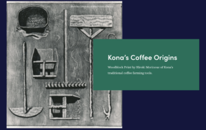 Woodblock Print by Hiroki Morinoue of Kona’s traditional coffee farming tools.